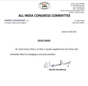 जालंधर, (punjabprotv) : आम आदमी पार्टी में शामिल होने से पहले कांग्रेस ने वेस्ट से पूर्व विधायक सुशील रिंकू को पार्टी से बाहर कर दिया है। पंजाब कांग्रेस के इंचार्ज हरीश चौधरी ने इस बाबत आदेश जारी कर दिए हैं।