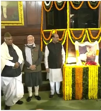 प्रधानमंत्री नरेंद्र मोदी समेत कई नेताओं ने मंगलवार को पराक्रम दिवस के मौके पर स्वतंत्रता सेनानी नेताजी सुभाष चंद्र बोस को श्रद्धांजलि अर्पित की। संसद के संविधान सदन में पीएम मोदी समेत कई नेताओं ने पहुंचकर नेताजी की तस्वीर पर फूल भी चढ़ाए। इस दौरान पीएम के साथ राज्यसभा में नेता प्रतिपक्ष और कांग्रेस अध्यक्ष मल्लिकार्जुन खरगे साथ खड़े दिखाई दिए। दोनों ने श्रद्धांजलि के बाद कुछ पर साथ में बातें भी कीं। इस दौरान लोकसभा स्पीकर ओम बिरला भी साथ रहे।