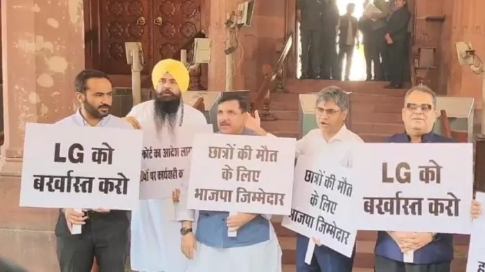 राजधानी दिल्ली में राव कोचिंग सेंटर में हुई छात्रों की मौत को लेकर आम आदमी पार्टी के सांसदों ने मंगलवार को जोरदार प्रदर्शन किया।