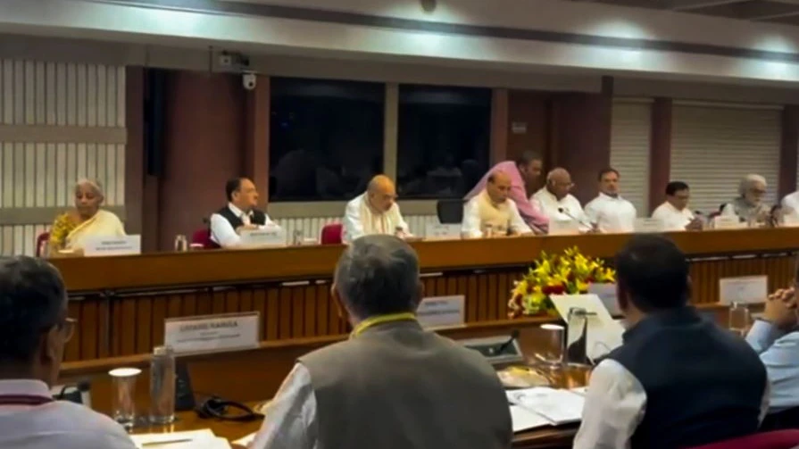 बैठक में शिवसेना शिंदे की ओर से श्रीकांत शिंदे, डीएमके से टी आर बालू, आप से संजय सिंह, कांग्रेस से राहुल गांधी और मल्लिकार्जुन खड़गे, विदेश मंत्री एस. जयशंकर, गृहमंत्री अमित शाह के अलावा बाकी तमाम दलों के नेता मौजूद रहे।