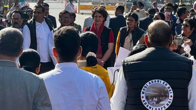 ਪ੍ਰਿਅੰਕਾ ਨੇ ਵੀ ਕਾਲੇ ਰੰਗ ਦੀ ਲੰਬੀ ਜੈਕੇਟ ਪਾਈ ਹੋਈ ਸੀ, ਪਰ ਦੂਜੇ ਸੰਸਦ ਮੈਂਬਰਾਂ ਦੀਆਂ ਜੈਕਟਾਂ ‘ਤੇ ‘ਮੋਦੀ-ਅਡਾਨੀ ਇੱਕ ਹਨ’ ਲਿਖਿਆ ਹੋਇਆ ਸੀ।
