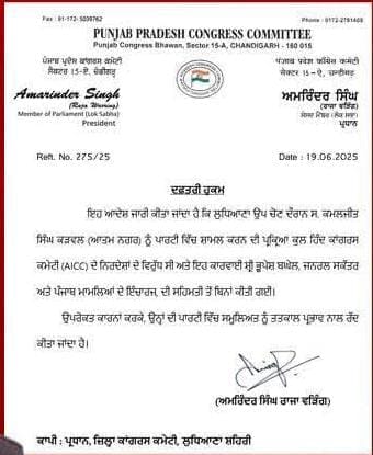 ਪੰਜਾਬ ਵਿੱਚ ਕਾਂਗਰਸ ਦੀ ਧੜੇਬੰਦੀ ਰੁਕਣ ਦਾ ਨਾਮ ਨਹੀਂ ਲੈ ਰਹੀ ਹੈ। ਕਾਂਗਰਸ ਪਾਰਟੀ ਵੱਲੋਂ ਆਤਮ ਨਗਰ ਹਲਕੇ ਤੋਂ ਕਮਲਜੀਤ ਸਿੰਘ ਕੜਵਲ ਦੀ ਮੈਂਬਰਸ਼ਿਪ ਰੱਦ ਕਰਨ ਦਾ ਪੱਤਰ ਵਾਇਰਲ ਹੋਇਆ ਹੈ। ਇਹ ਪੱਤਰ 19 ਜੂਨ, 2025 ਦਾ ਹੈ, ਪਰ ਇਹ ਹੁਣ ਵਾਇਰਲ ਹੋ ਗਿਆ ਹੈ।